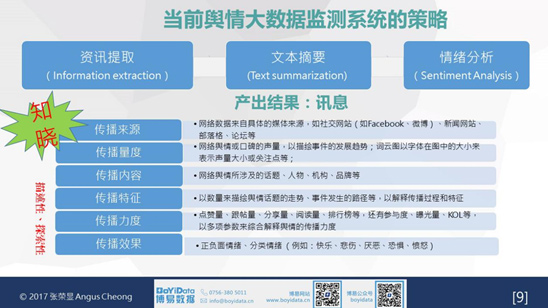 目前輿情大數據監測系統的策略主要有資訊提取,文本摘要和情緒分析三部分。處理網絡數據的情況,絕大部分是基於描述性和探索性的單變量分析,包括傳播來源(網絡數據來自具體的媒體來源,如社交網站、新聞網站、博客、論壇等)、傳播量度(網絡輿情或口碑的聲量,以描繪事件的發展趨勢;詞雲圖以字體在圖中的大小來表示聲量大小或關注點等)、傳播內容(網絡輿情所涉及的話題、人物、機構、品牌等)、傳播特徵(以數量來描繪輿情話題的走勢、事件發生的路徑等,以解釋傳播過程和特徵)、傳播力度(點讚量、跟帖量、分享量、閱讀量、排行榜等,還有參與度、曝光量、KOL等,以多項參數來綜合解釋輿情的傳播力度)和傳播效果(正負面情緒、分類情緒如快樂、悲傷、厭惡、恐懼和憤怒等)。