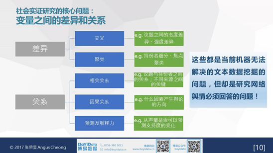 社會實證研究的核心問題是研究變量之間的差異和關係,包括交叉和聚類,相關和因果關係等,這也是研究網絡輿情必須回答的問題,然而卻是當前機器無法解決的文本數據挖掘的問題,因此要突破基本的描述性和探索性,深入到解釋性的程度,是學術研究或商業決策的努力方向。