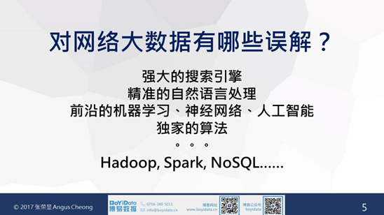 張博士指出,當前有觀點認爲,網絡大數據可以做到精確預測。然而,在實際應用中,大數據的算法、語義分析等,距離現實尚有一段距離,水平待有提高,加上歧義和無關數據的干擾,也在影響著數據分析結果的準確度。還有觀點認爲,當數據量足夠大的時候,數據便可以自己說出結論等,這是非常危險的論斷。這些誤解都忽略了文本數據本身的非結構化特徵,以及文本背後的語義和語境的複雜性。